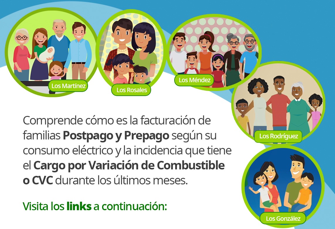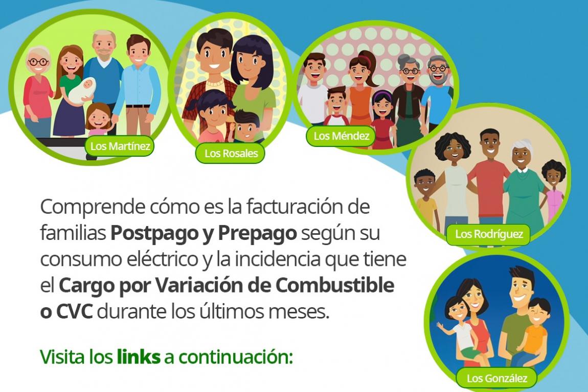 Hemos preparado estos videos como guia para que nuestros clientes conozcan cómo es la facturación mensual de familias con tarifas postpago y prepago según su consumo en kWh y además, la incidencia del Cargo por Variación de Combustuble o CVC en los últimos meses.